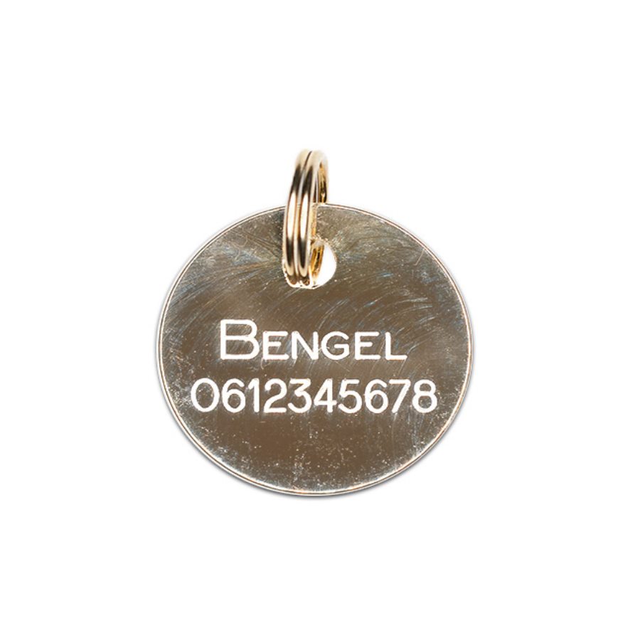 Deze hondenpenningen zijn verkrijgbaar in nikkel (zilverkleurig) of messing (goudkleurig).