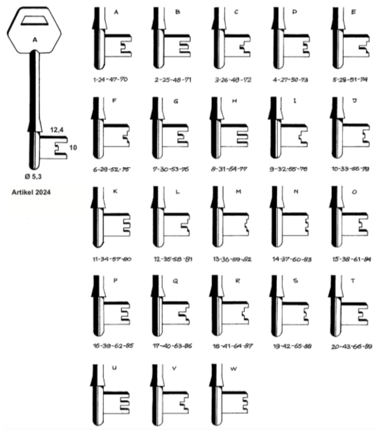 De nummering van de sleutels kan bestaan uit letters of uit cijfers. Deze nummering loopt van A t/m W of 1 t/m 92.