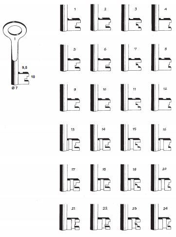 De sleutelnummers van deze sleutel lopen van 1 t/m 24. De lengte van de sleutel is 68mm. De sleutels zijn geboord, d.w.z. met een gat in de sleutel zelf. (pijpsleutel)