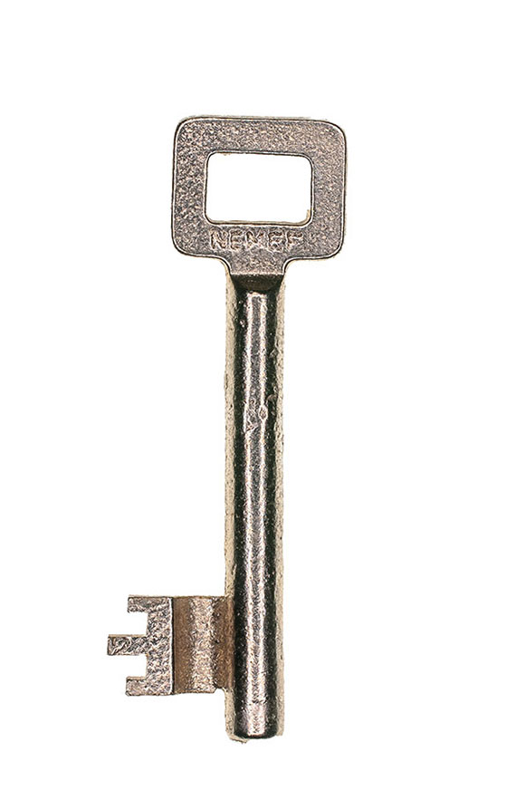 Een veel voorkomende sleutel van het merk Nemef met de bekende ‘vierkante kop’.