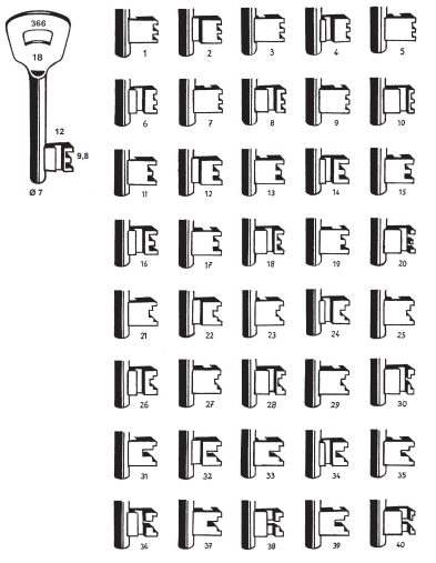 De serie loopt van 1 t/m 40. Het serienummer 366 staat vaak samen met het sleutelnummer op de kop van de sleutel.