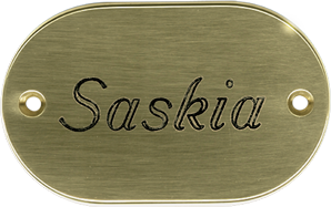 Specificaties Maat: 9.5 x 6 cm Bewerking: Gravure Bevestiging: Met bijgeleverde messing schroeven Onderhoud: n.v.t. Reiniging: Alle niet agressieve reinigingsmiddelen