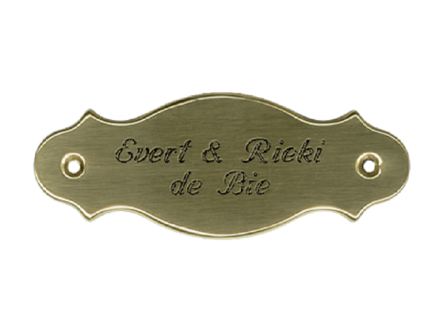 Specificaties Maat: 13 x 5 cm Bewerking: Gravure Bevestiging: Met bijgeleverde messing schroeven Onderhoud: n.v.t. Reiniging: Alle niet agressieve reinigingsmiddelen